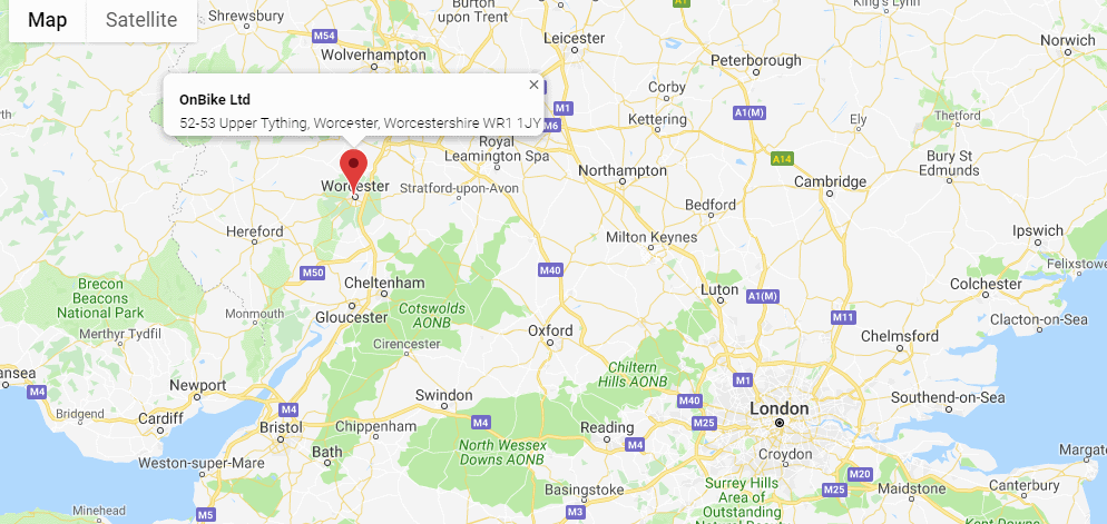 OnBike is located just 10 minutes off the M5 in the heart of the West Midlands, not far from Worcester city centre and Birmingham, and very easy to find whether visiting by road or rail.
