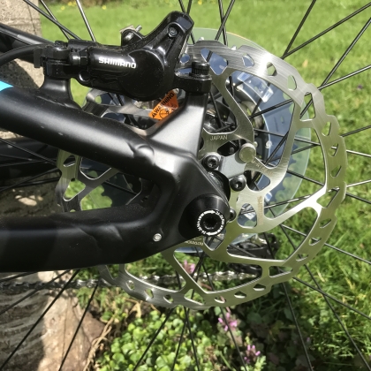 In addition, there’s the facility to mount a bottle cage at the same point rather than an additional battery. This comes with a handy little compartment for keys, etc. A set of Continental Mountain King plus-sized tyres complement the bike nicely, and are more than up to the job. One further point of note is that the speed sensor magnet isn’t sat in the spokes like it is on most ebikes. You’ll find this little fella sat on a mount adjacent to the rotor with the sensor nicely concealed in the frame!